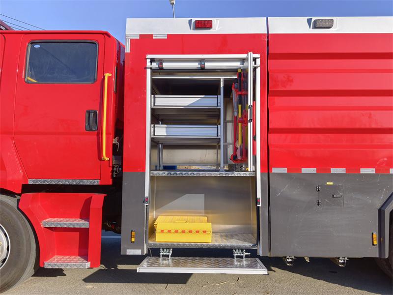 • Equipment Room: Matatagpuan sa harap ng superstructure ng sasakyan, nilagyan ang kuwartong ito ng mga equipment rack at pull-out hanging shelves. Ang mga rack ay lohikal na idinisenyo upang maayos na mag-imbak ng iba't ibang kagamitan sa paglaban sa sunog (mga fire suit, fire blanket, hose cover, fire bridge, fire extinguisher, atbp.); ang mga nakabitin na istante ng pull-out ay nagbibigay ng madali at mabilis na pag-access sa mga karaniwang ginagamit na kagamitan tulad ng mga fire ax, pick, pala, wrenches, martilyo, at crowbar, na nagpapahusay sa kahusayan sa pagsagip.