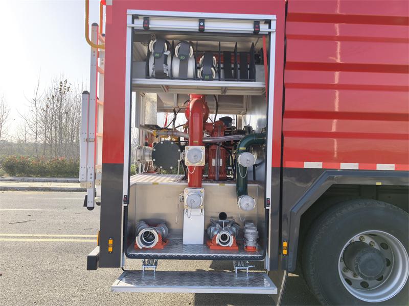 Ang CB10/140-XZ fire pump na may rate na daloy na 100L/s@1MPa ay naka-install sa pump room sa likuran ng sasakyan. Ang bomba ng sunog na ito ay maaasahan at maaaring magbigay ng malakas na presyon ng tubig, na tinitiyak na ang mga hose ng apoy ay maaaring mag-spray ng tubig o foam sa mataas na presyon sa malalayong distansya para sa pamatay ng apoy.