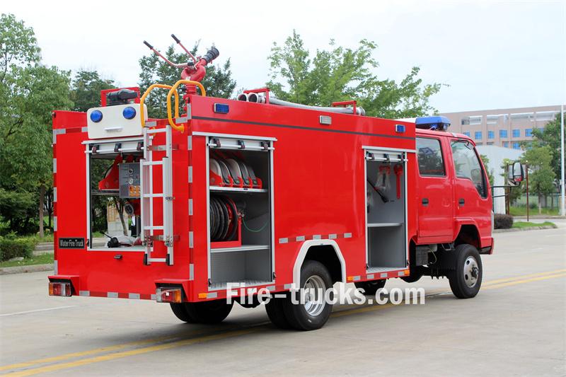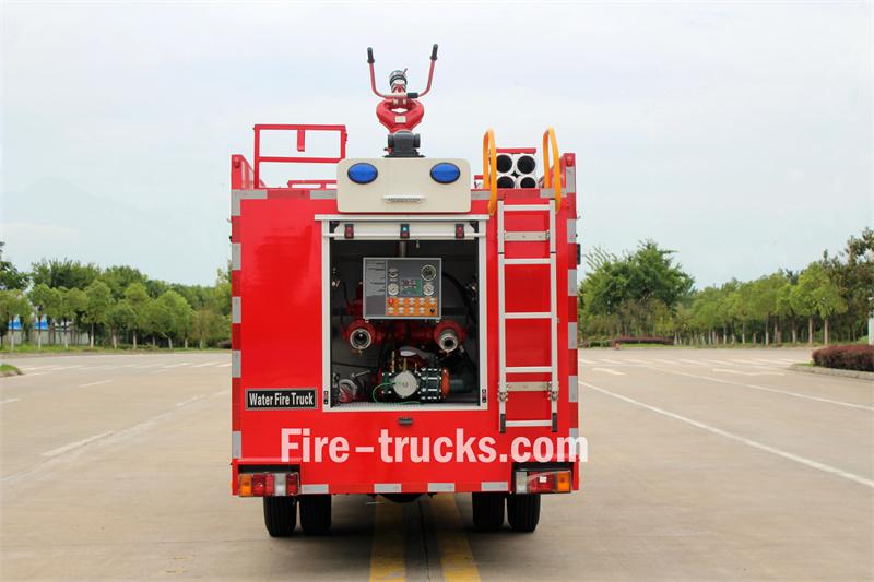 Ang Isuzu 3cbm water tanker fire truck na ito ay batay sa isang Isuzu 100P 4x4 double-cab chassis na may 3360mm wheelbase. Nilagyan ito ng Isuzu 4KB1-TCG60 engine at isang MSB 5-speed gearbox. Ang harap ng superstructure ay naglalaman ng kompartimento ng kagamitan, ang gitnang seksyon ay naglalaman ng 300L carbon steel na tangke ng tubig, at ang likuran ay ang pump room, na nilagyan ng CB10/60-XZ fire pump, control panel, fire hoses, firefighting equipment, atbp. Ang PS8/30W fire monitor ay naka-mount sa bubong.