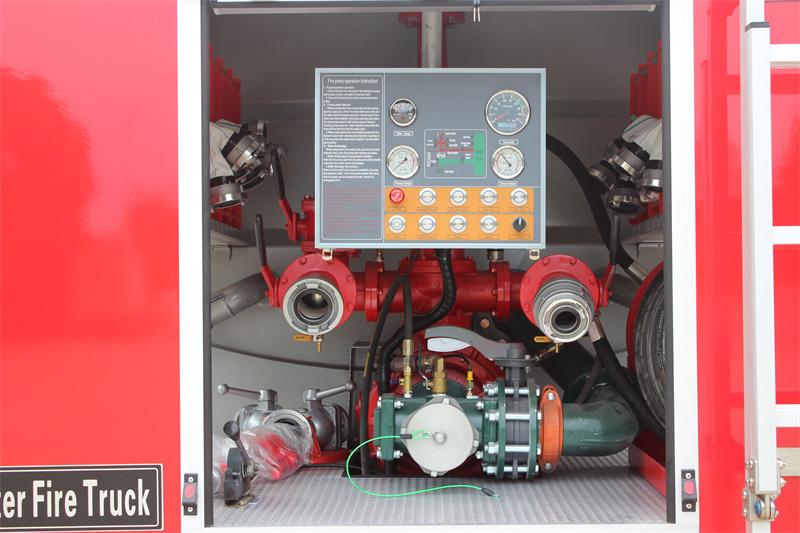 Control panel: Matatagpuan sa pump room, isinasama nito ang water level gauge, pressure gauge, vacuum gauge, tachometer, emergency brake, equipment room light, pump room light, side light, tail light, priming switch, main power switch, electronic throttle, at iba pang mga button; mga tagubilin sa pagpapatakbo ng bomba ng sunog, diagram ng piping ng tangke ng tubig, atbp. Ang interface ay intuitive, na nagpapadali sa real-time na pagsubaybay at pagpapatakbo ng mga kaugnay na button ng mga bumbero.