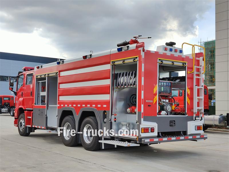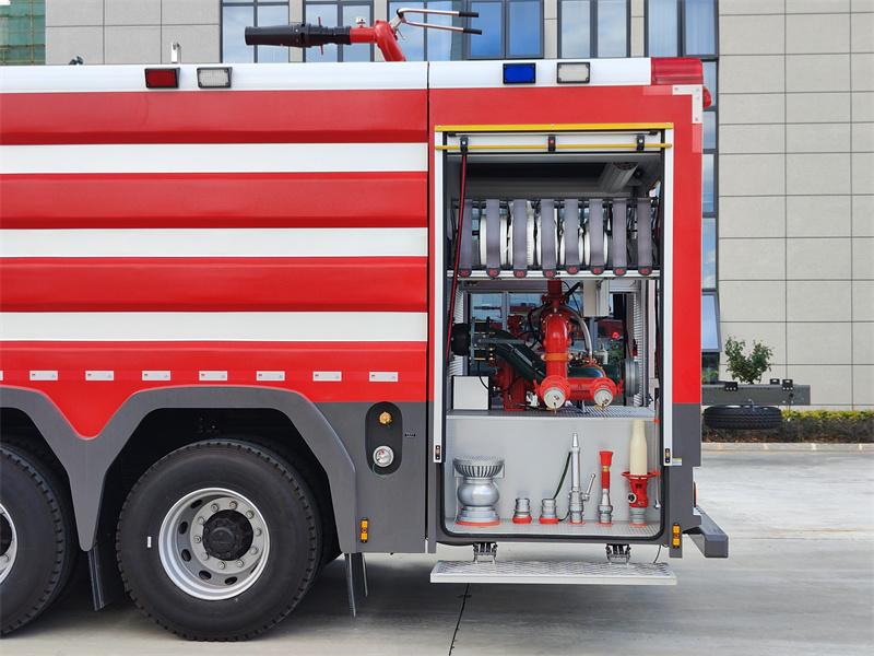 Ang Isuzu GIGA 6X4 10 cubic meter foam fire truck ay batay sa Isuzu GIGA 6X4 chassis, na may wheelbase na 4600mm+1370mm. Nilagyan ito ng Isuzu 6UZ1-TCG61 engine at Fast 12-speed transmission. Ang harap ng superstructure ay naglalaman ng kompartimento ng kagamitan, ang gitnang seksyon ay naglalaman ng isang 8500L carbon steel na tangke ng tubig at isang 1500L na hindi kinakalawang na asero na foam tank, at sa likuran ay ang pump room, na nilagyan ng CB10/60-XZ fire pump, control panel, fire hoses, firefighting equipment, atbp. Ang isang PL8/48 fire monitor ay matatagpuan sa bubong.
