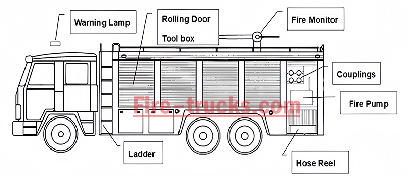 • Silid ng Kagamitan: Matatagpuan sa harap ng superstructure ng sasakyan, ang silid na ito ay may mga rack para sa kagamitan at mga pull-out na nakasabit na istante. Ang mga rack ay lohikal na dinisenyo upang maayos na maiimbak ang iba't ibang kagamitan sa pag-apula ng sunog (mga fire suit, fire blanket, takip ng hose, fire bridge, fire extinguisher, atbp.); ang mga pull-out na nakasabit na istante ay nagbibigay ng madali at mabilis na pag-access sa mga karaniwang ginagamit na kagamitan tulad ng mga palakol sa sunog, piko, pala, wrench, martilyo, at crowbar, na nagpapabuti sa kahusayan ng pagsagip.