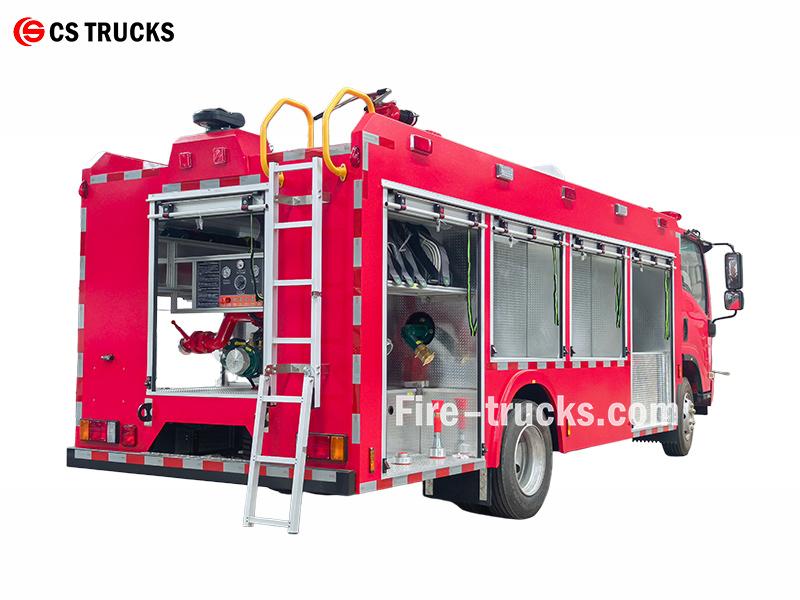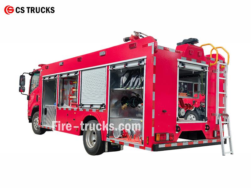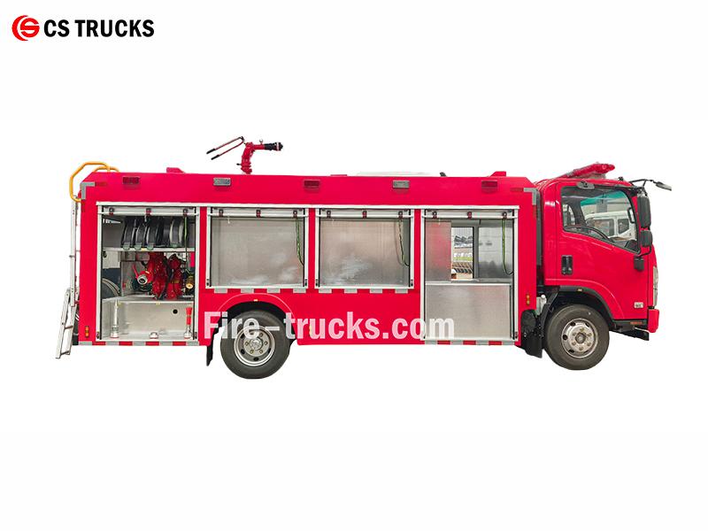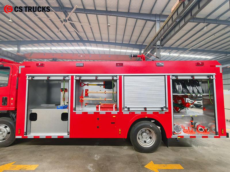 Ang ISUZU 4000L water fire truck ay gumagamit ng 4HK1-TC engine na may kapasidad na 175 HP, na binuo sa isang 4×2 ISUZU chassis. Isang 4,000L na tangke ng tubig ang nasa likod ng cabin, na may CB10/30-RS fire pump (30L/s sa 1.0MPa) na nakakabit sa likurang pump room. Ang isang PS8/30W roof monitor ay naghahatid ng saklaw ng tubig na ≥60m, na sumasaklaw sa buong 360° nang pahalang at -35° hanggang 70° nang patayo. Ang mga kompartamento ng kagamitan sa magkabilang panig ay nagbibigay ng imbakan para sa mga hose ng sunog, mga suction tube, at mga kagamitan sa pagsagip, kasama ang lahat ng karaniwang aksesorya.